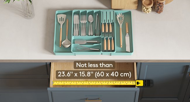 Please measure your drawer to ensure proper fit. Our organizer measures 39cm in length, 4.6cm in height, and can expand from 33cm to 60cm in width, which fits various drawer sizes effortlessly.